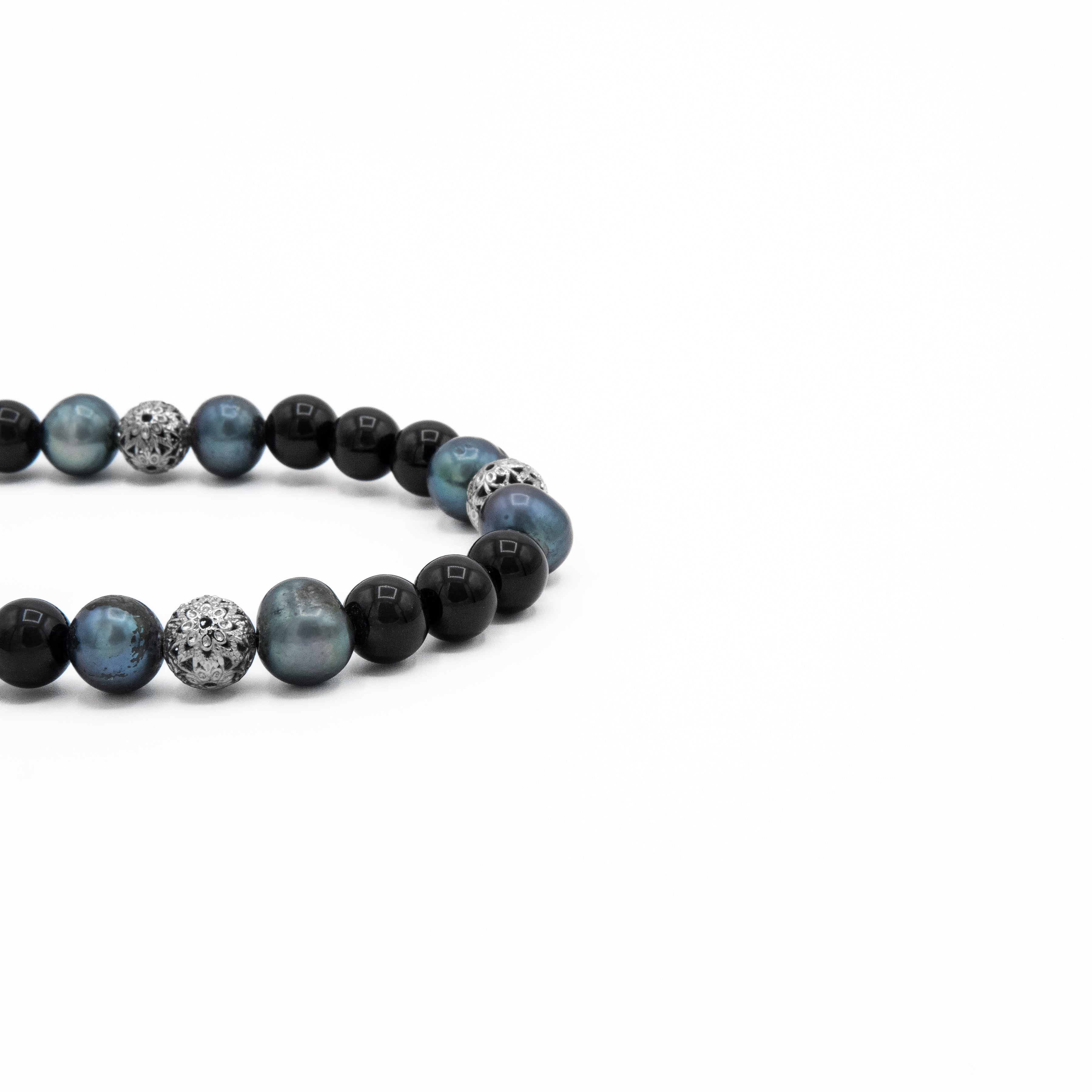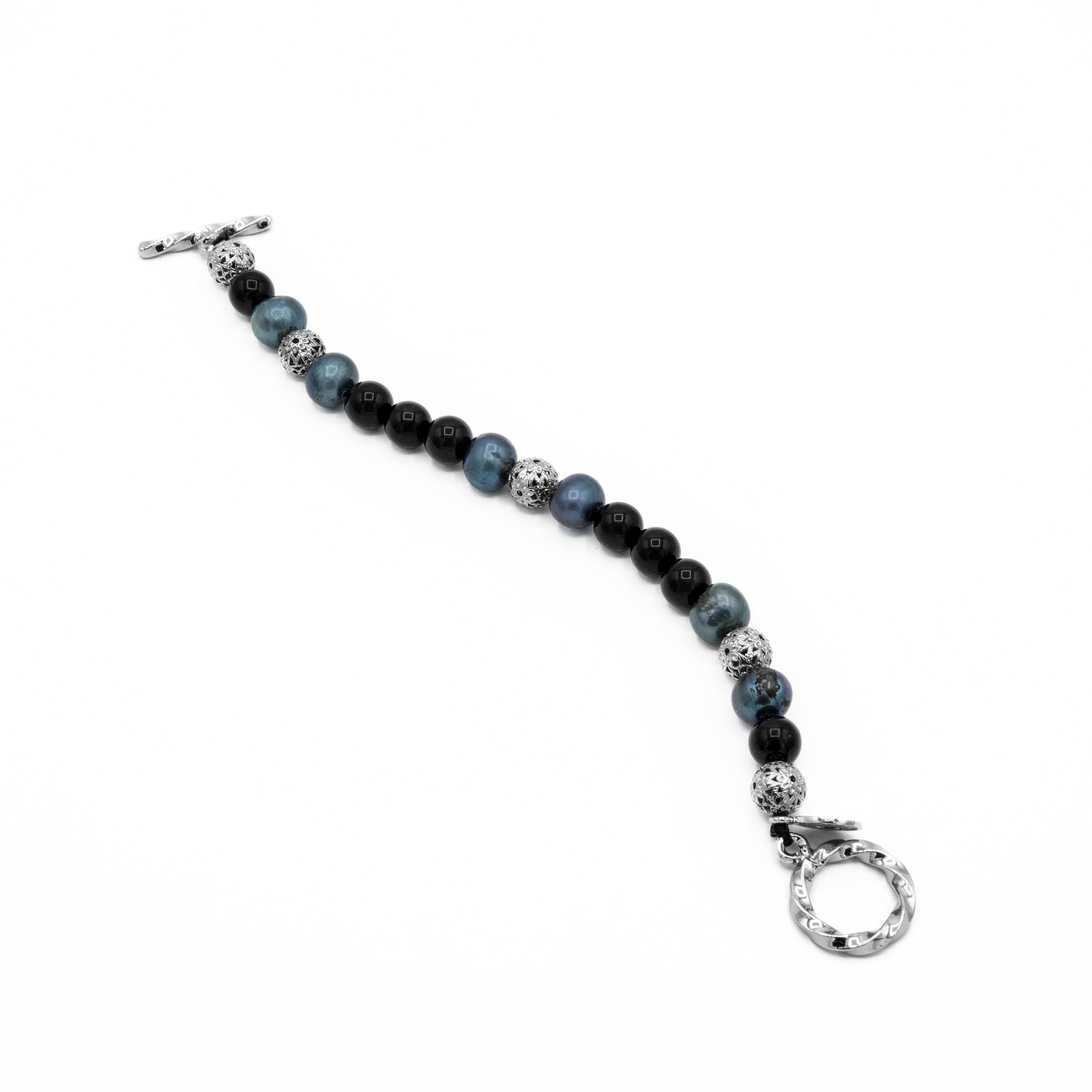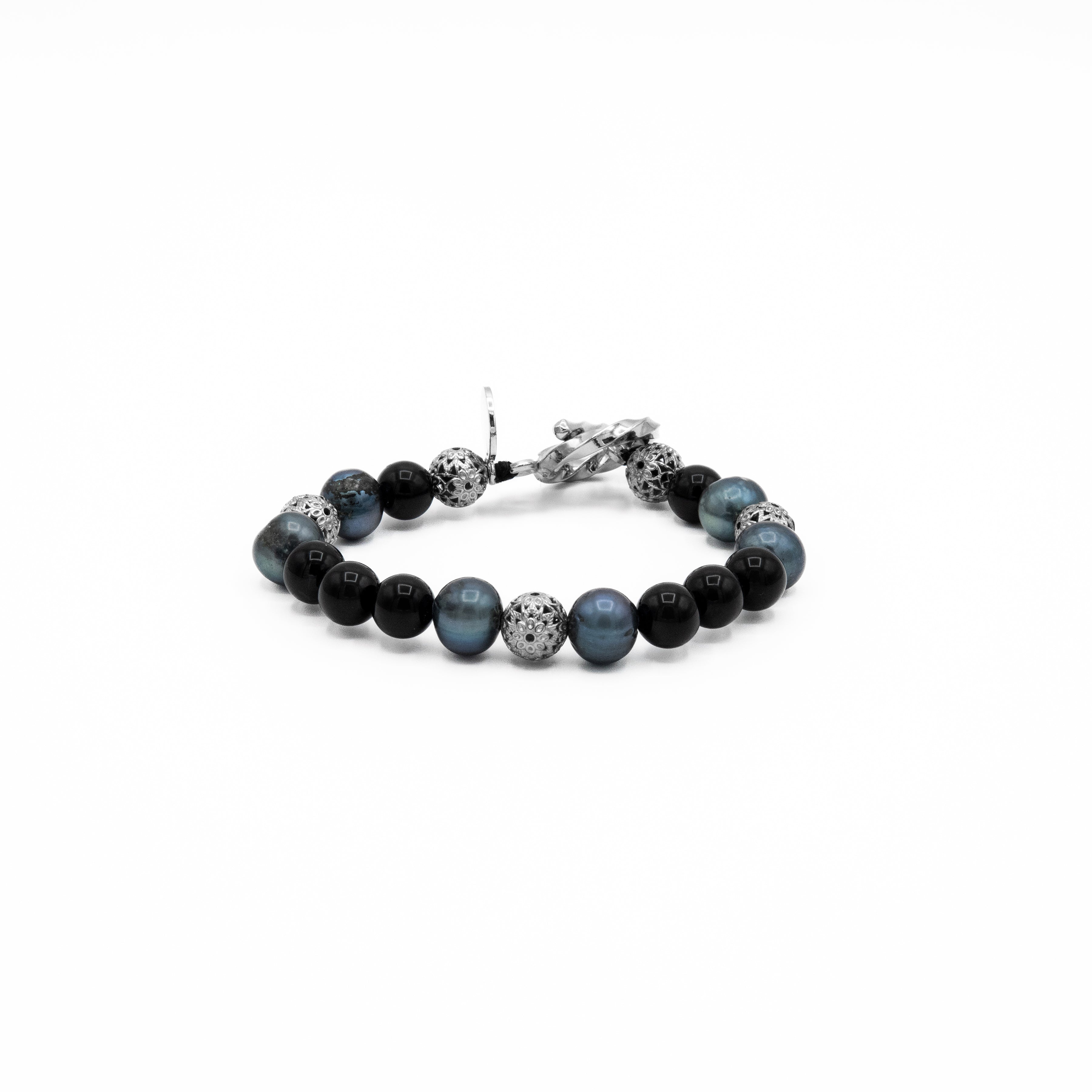 This bracelet is a sleek fusion of moody elegance and radiant luster, designed for those who appreciate deep, captivating contrast. Meticulously handcrafted, it alternates between smooth, deep Black Agate stones and lustrous grey pearls, with a single, intricately detailed sterling silver bead placed prominently at the center. The design is secured with a distinguished toggle lock, adding both a reliable closure and an eye-catching element.