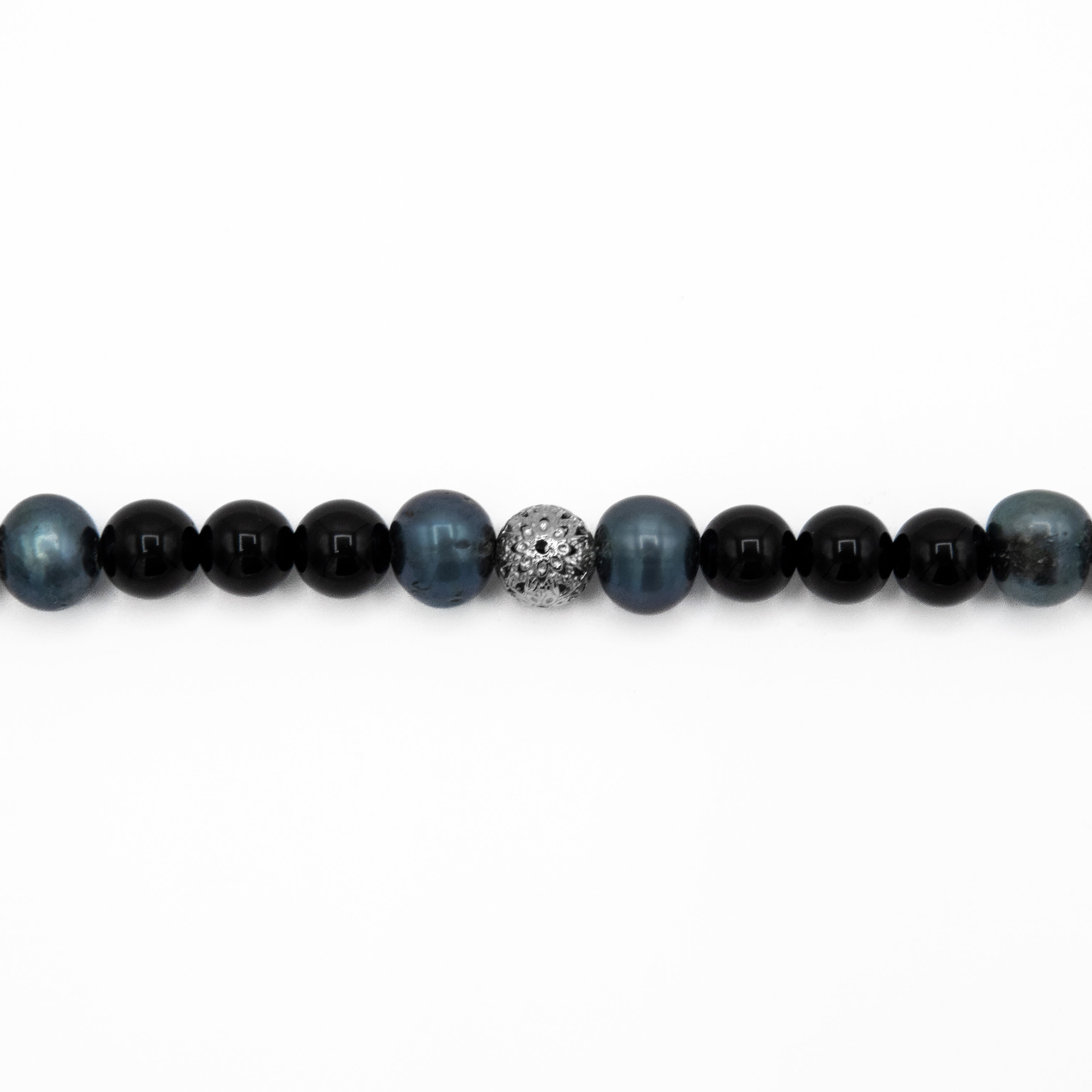 The alternating stones create a striking rhythm: the intense, polished black of the Black Agate symbolizes strength, while the smoky, iridescent sheen of the grey pearls adds a touch of luxurious mystery and grace!