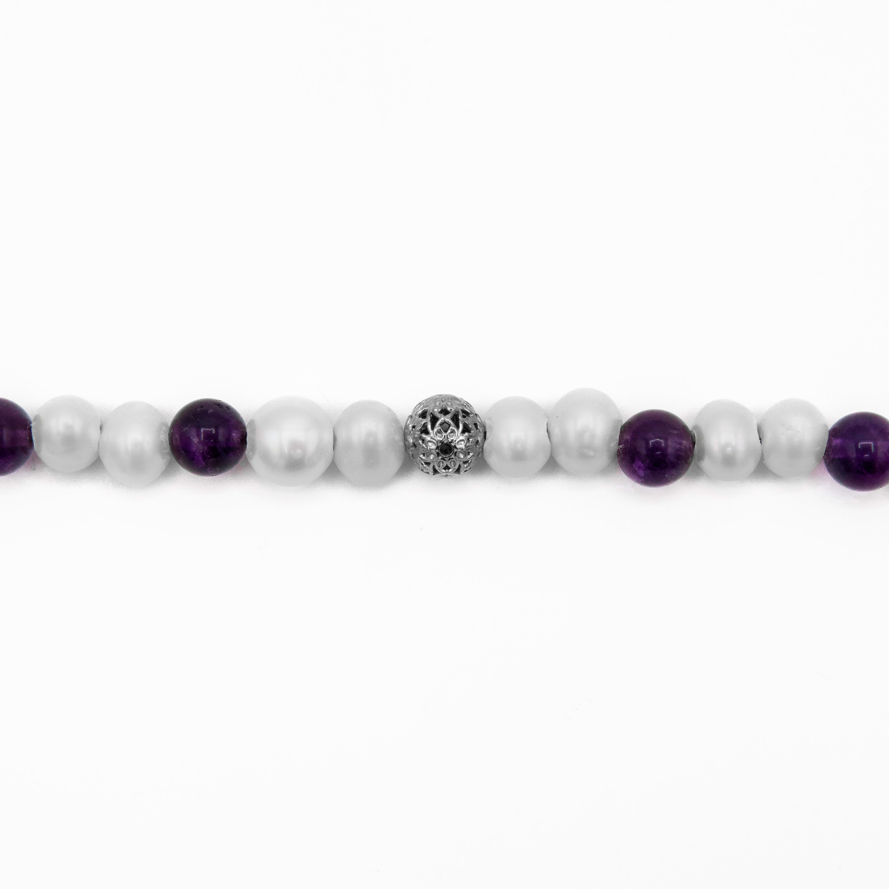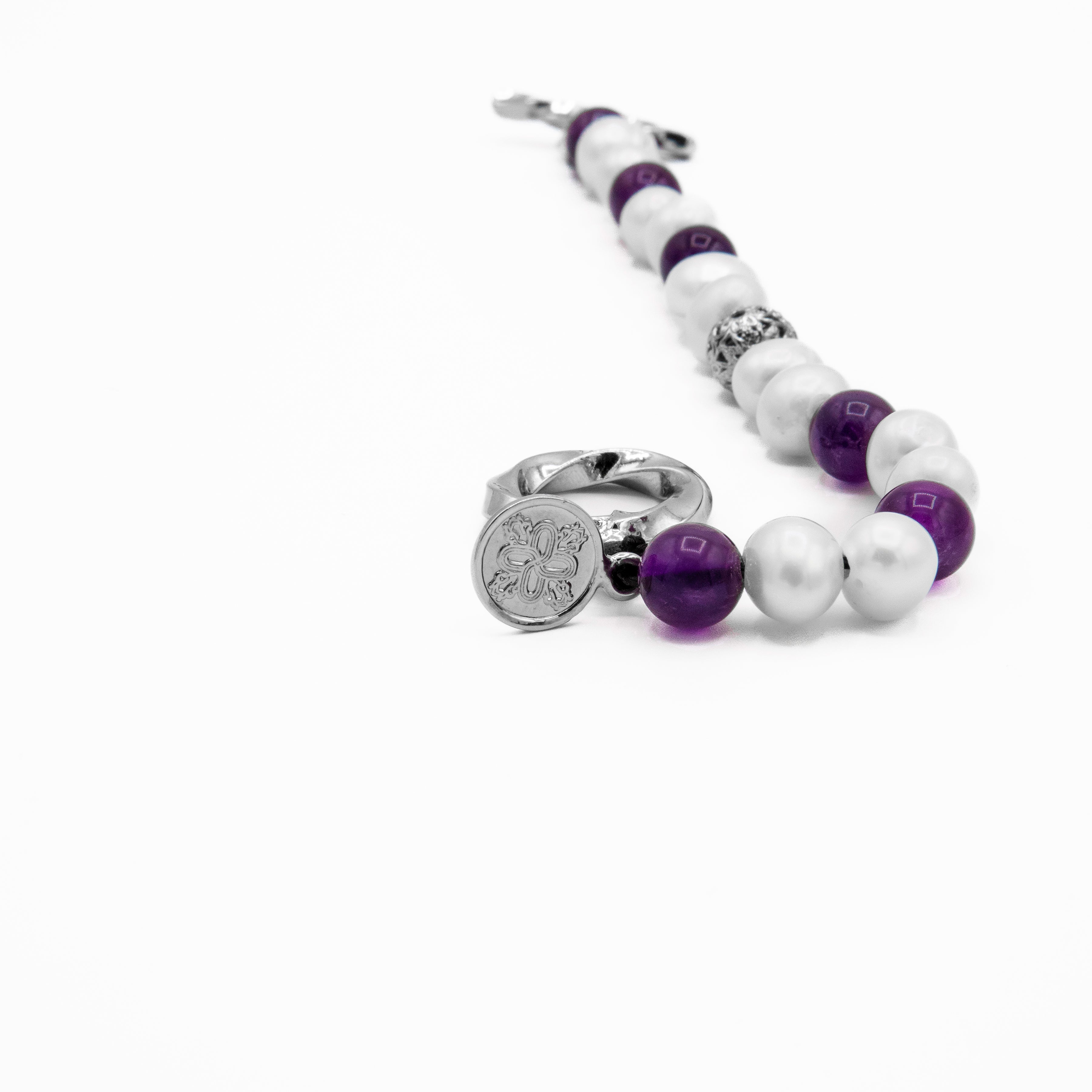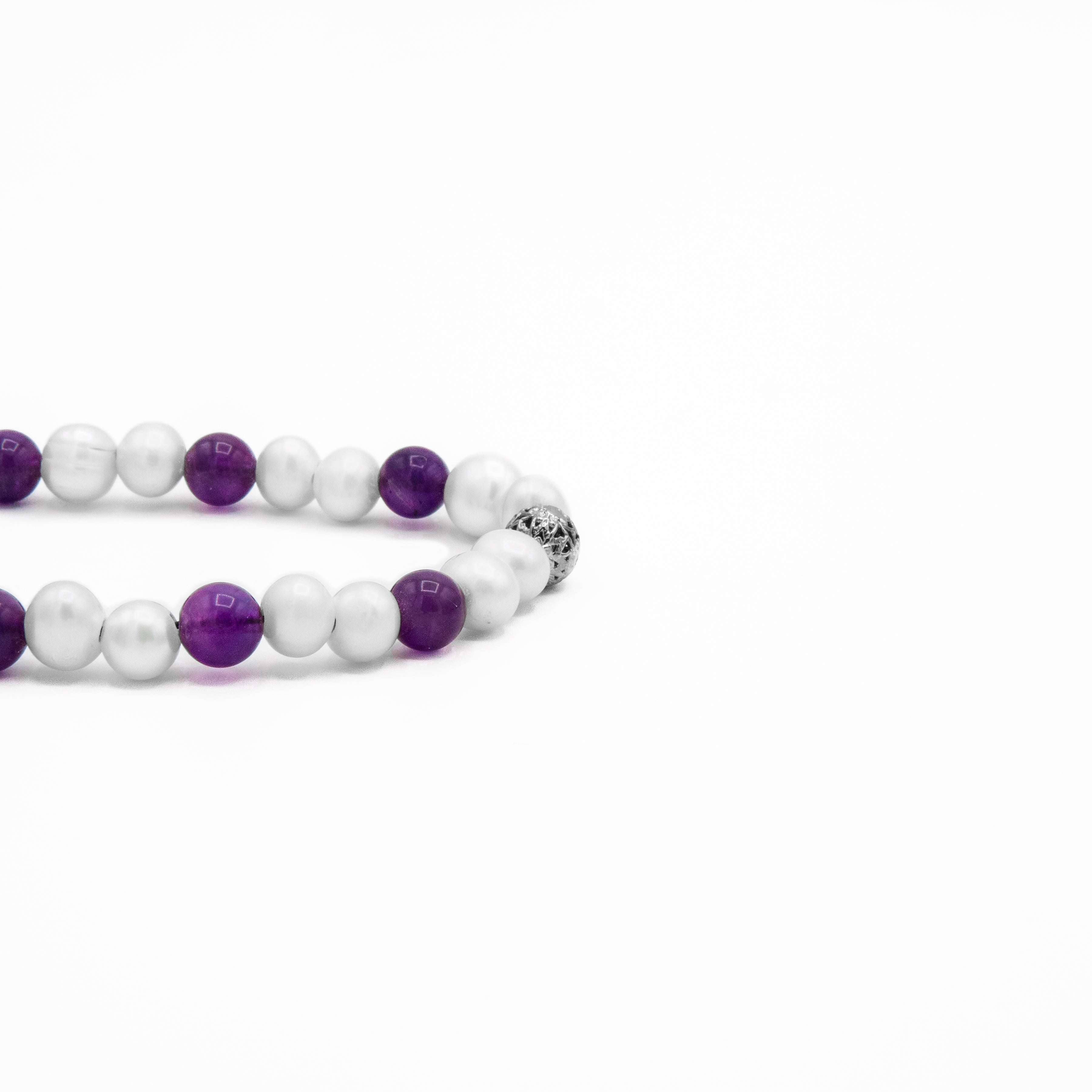 The contrast between the two elements is sophisticated and meaningful: the calming, spiritual energy of the Amethyst (symbolizing wisdom and stress relief) is beautifully complemented by the pure, classic glow of the white pearls (representing purity and elegance), creating an accessory that is both serene and luxurious.