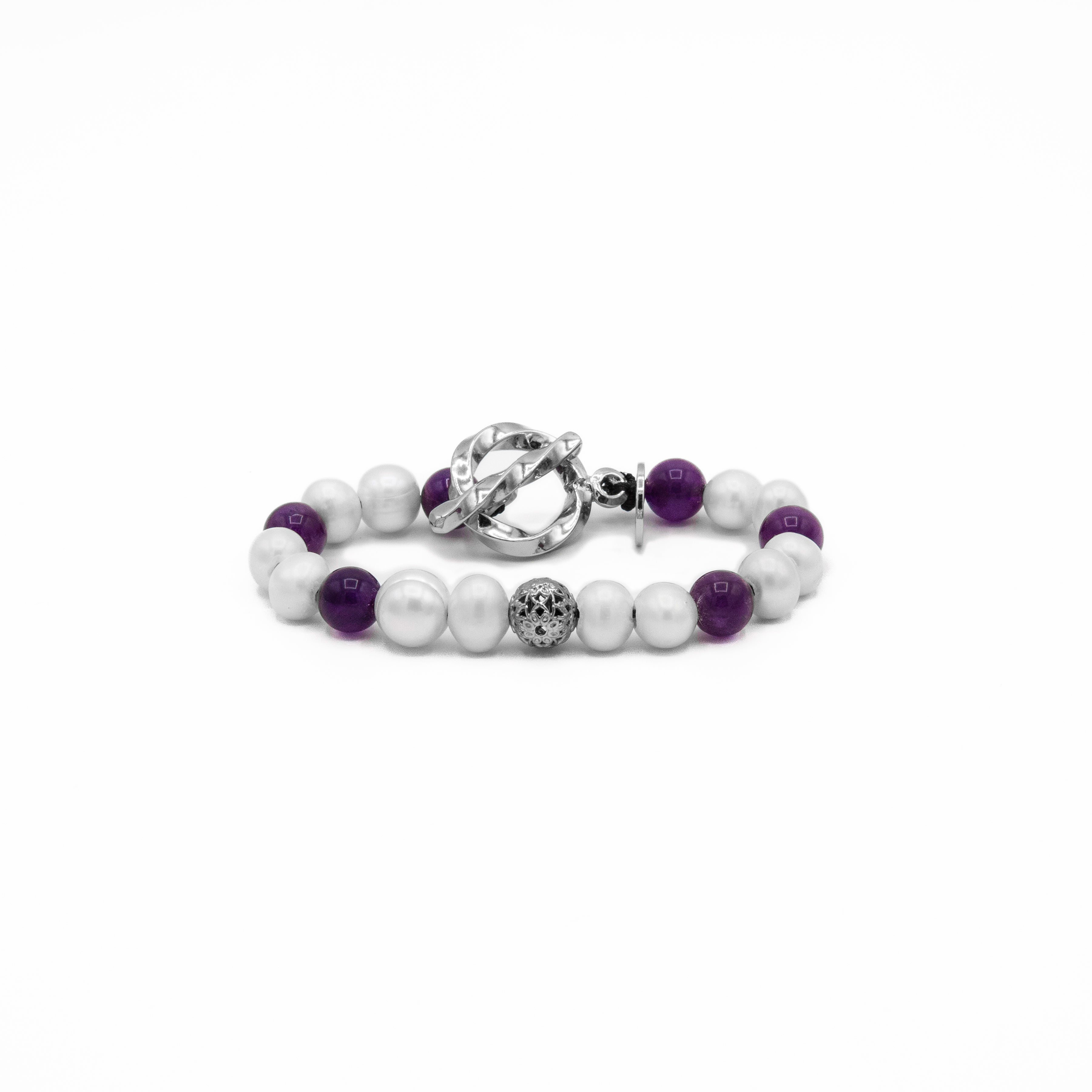 This bracelet is a breathtaking harmony of royal purple and luminous white. Meticulously handcrafted, it features an alternating pattern of deep purple Amethyst stones and smooth, radiant white pearls. A single, intricately detailed sterling silver bead is placed prominently at the center, and the piece is secured with a distinguished toggle lock.