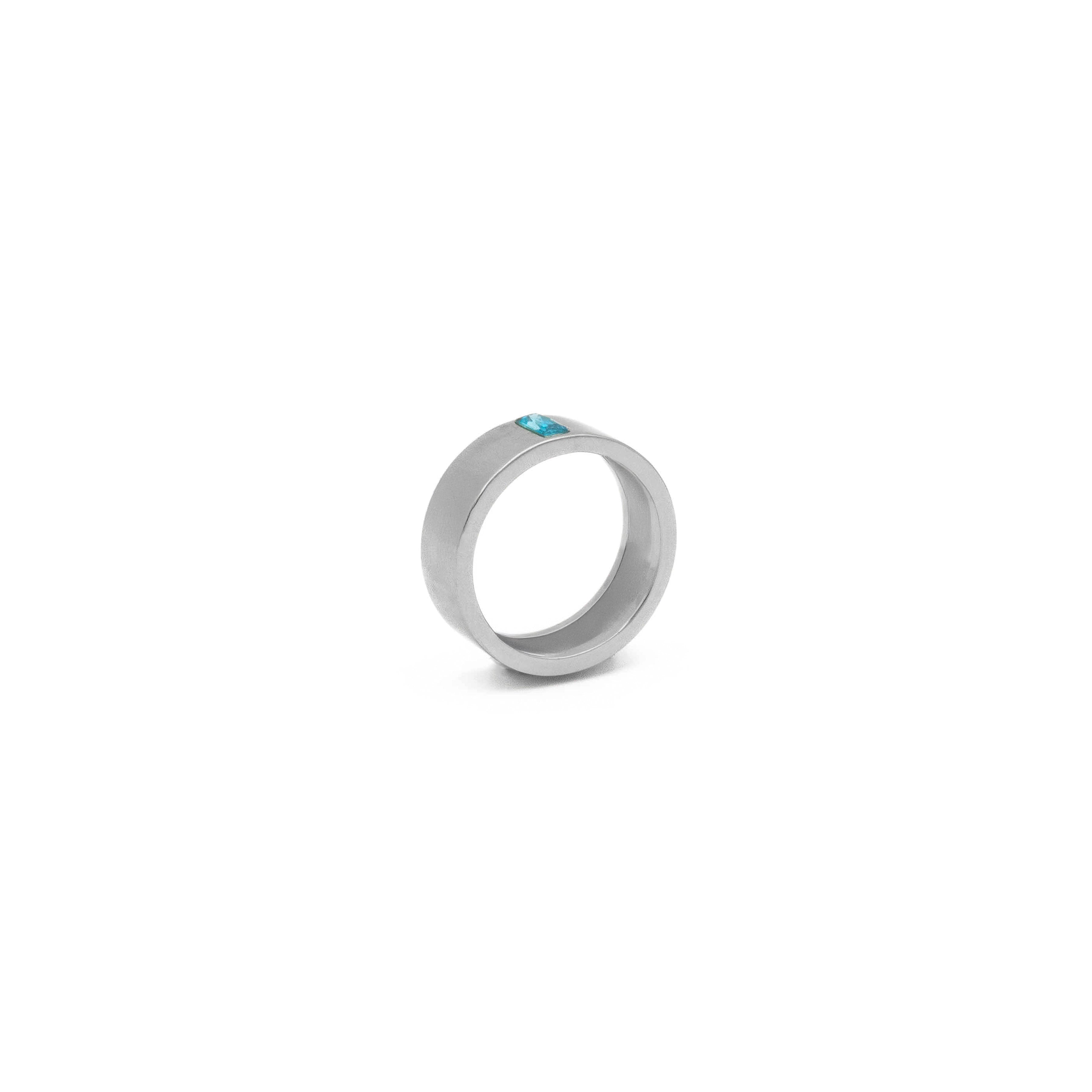 At its center lies a deep blue stone, precisely set to catch the light with quiet strength. The cool-toned hue evokes depth and clarity, making the ring a minimalist yet striking piece that transitions effortlessly from day to night.