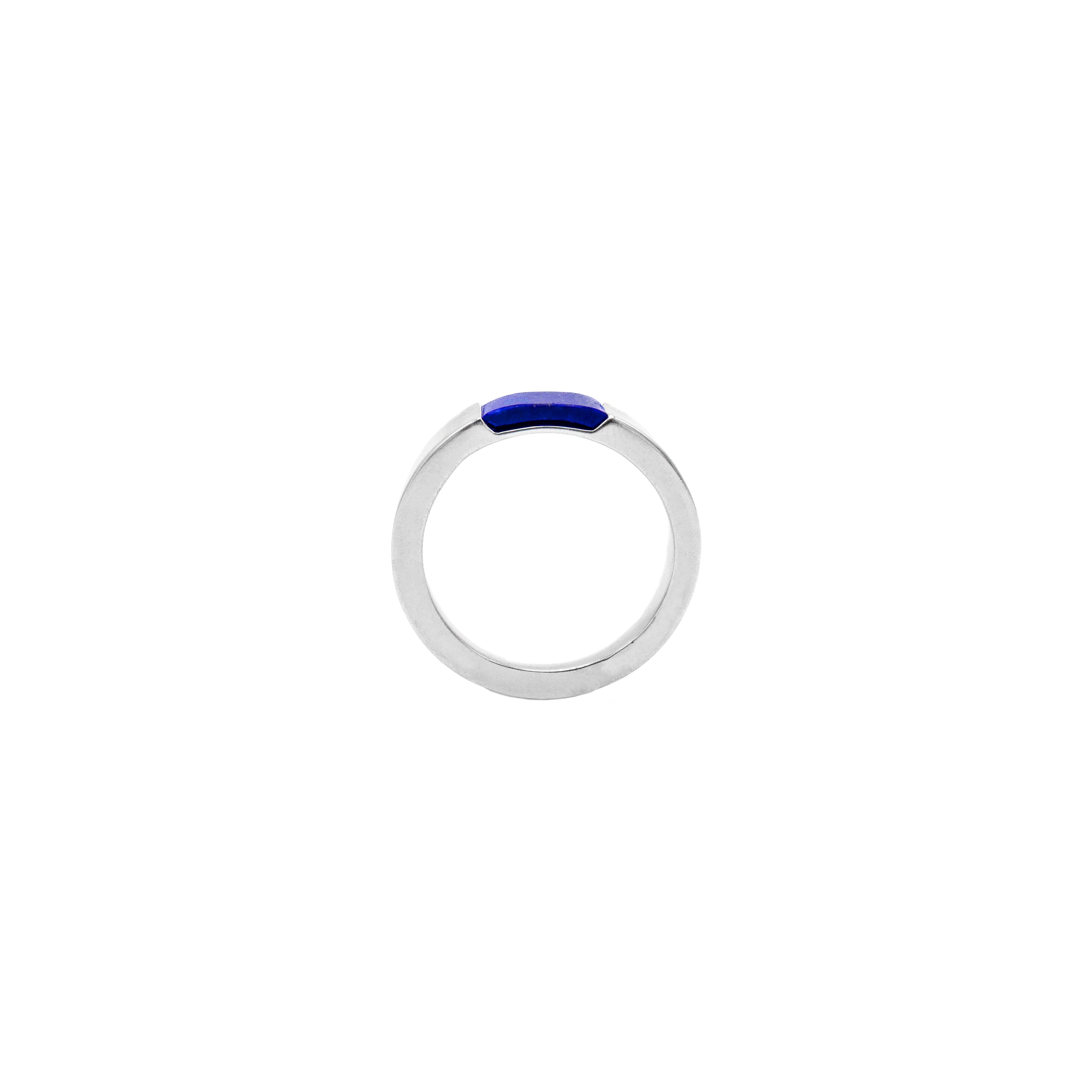 Set at its core is a striking lapis lazuli stone, prized for its celestial blue tone and natural flecks of gold. Sleek and uninterrupted in its contours, this ring speaks to those who appreciate quiet strength and enduring design.