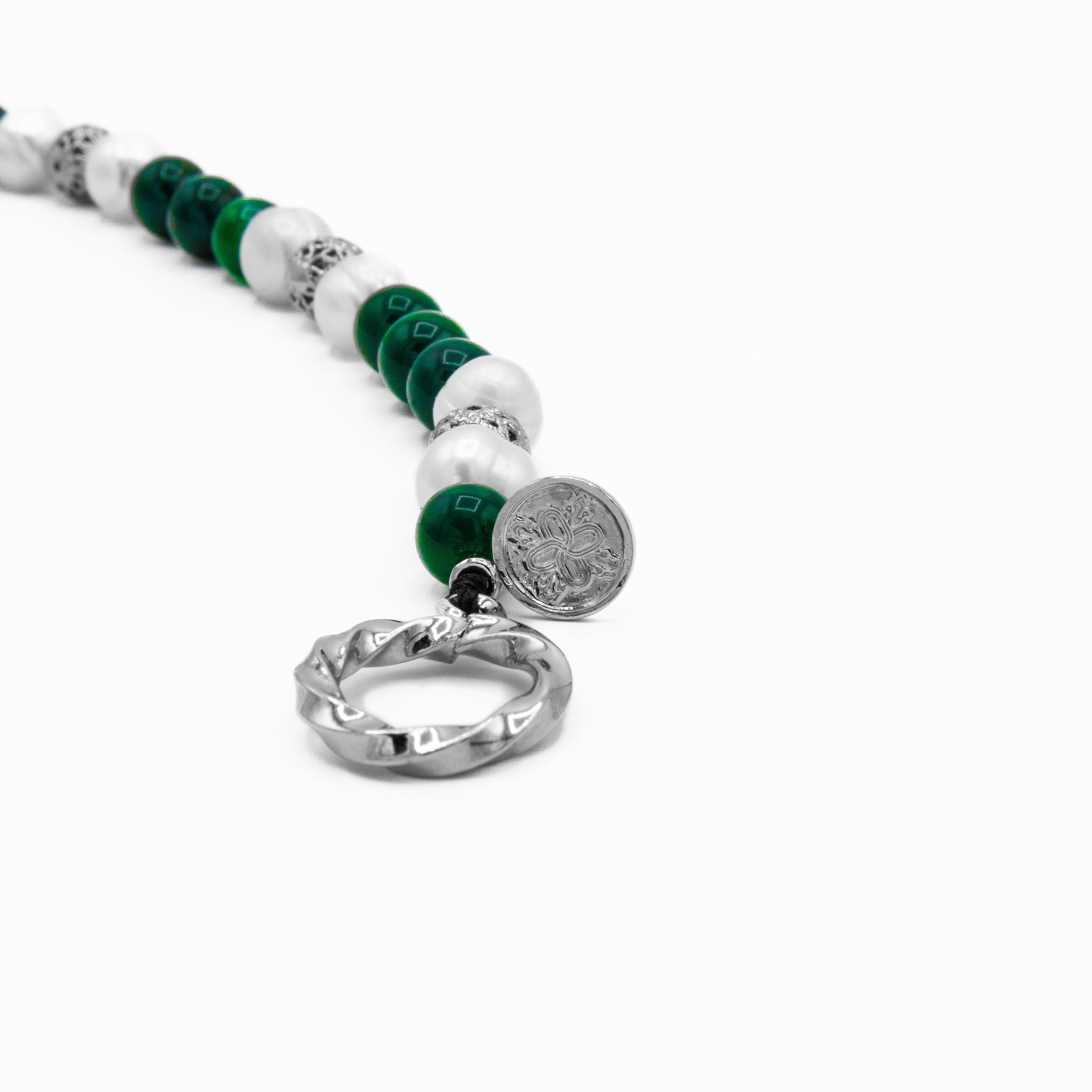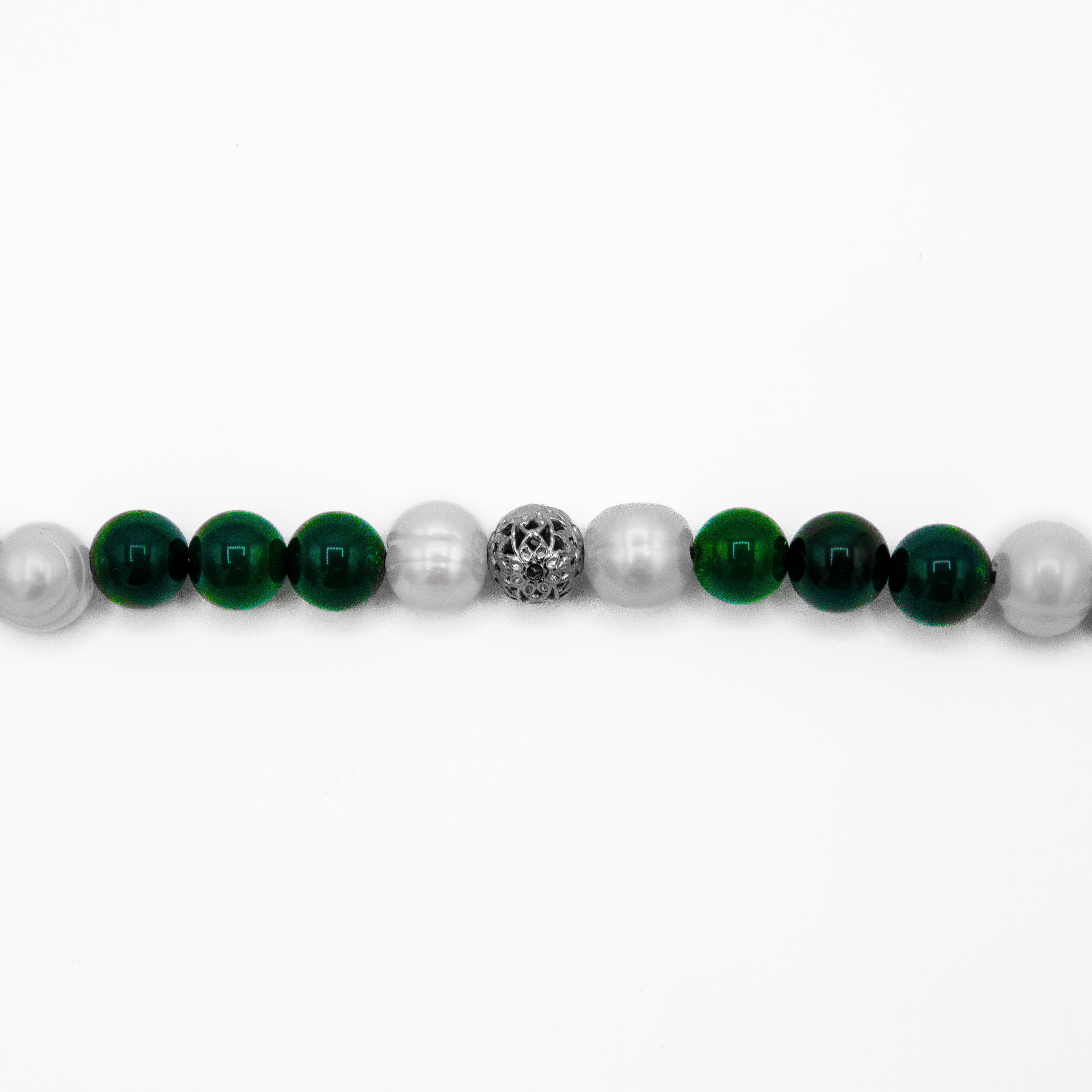 This bracelet is a luxurious and vibrant blend of earth and sea, designed for those who embrace contrasted beauty. Meticulously handcrafted, it alternates between luminous white pearls and deep green Agate stones. The design is beautifully accented with three intricately detailed sterling silver beads, one on the bar of the toggle and two framing the bead section, and is secured with a classic toggle lock.
