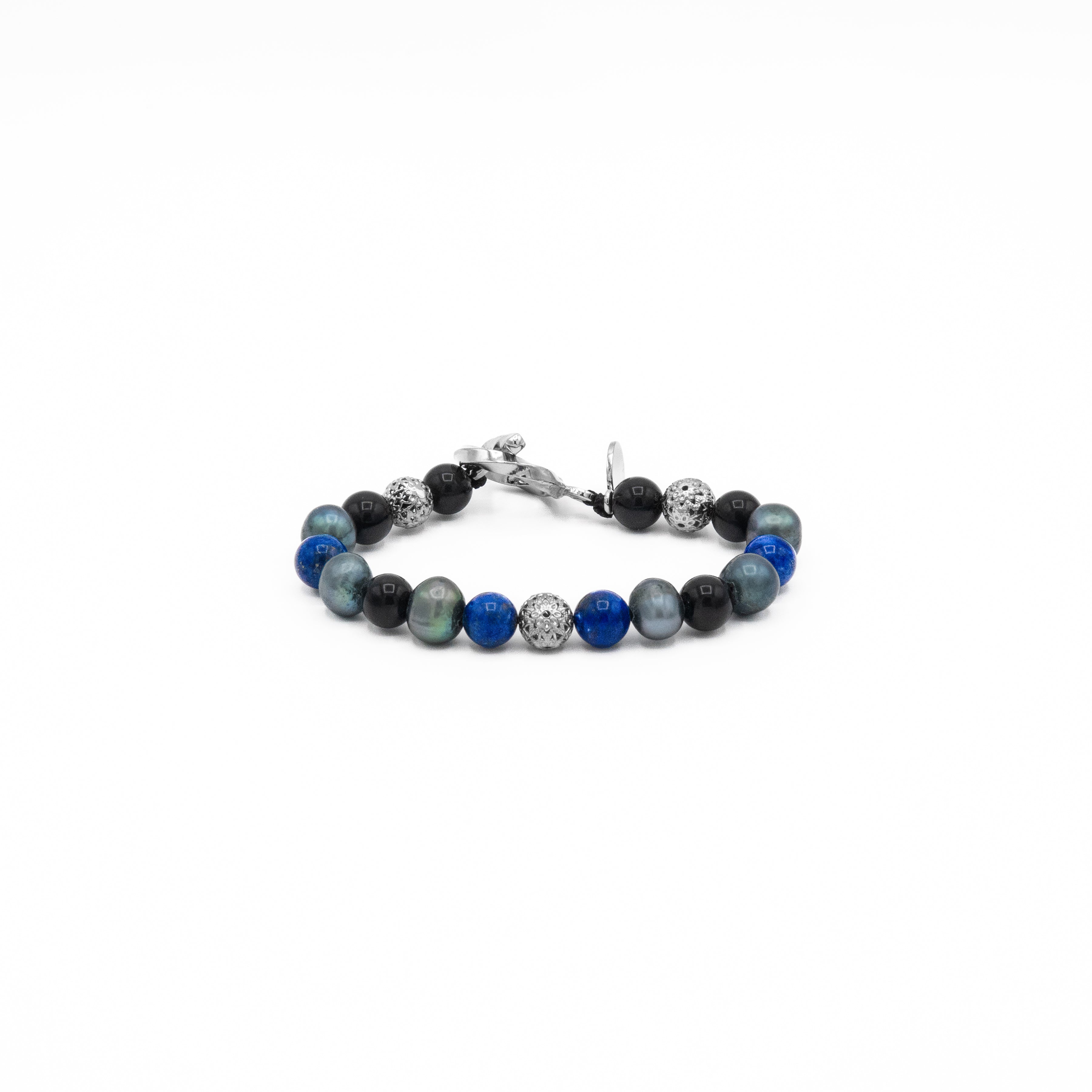 This bracelet is a rich tapestry of deep, cosmic colors, designed for the wearer who embodies complexity and refined taste. Meticulously handcrafted, it artfully combines smooth Black Agate, profound Lapis Lazuli, and smoky grey pearls. These unique stones are spaced and accented by three intricately detailed sterling silver beads, and the design is secured with a distinguished toggle lock, adding both a reliable closure and a bold finish.