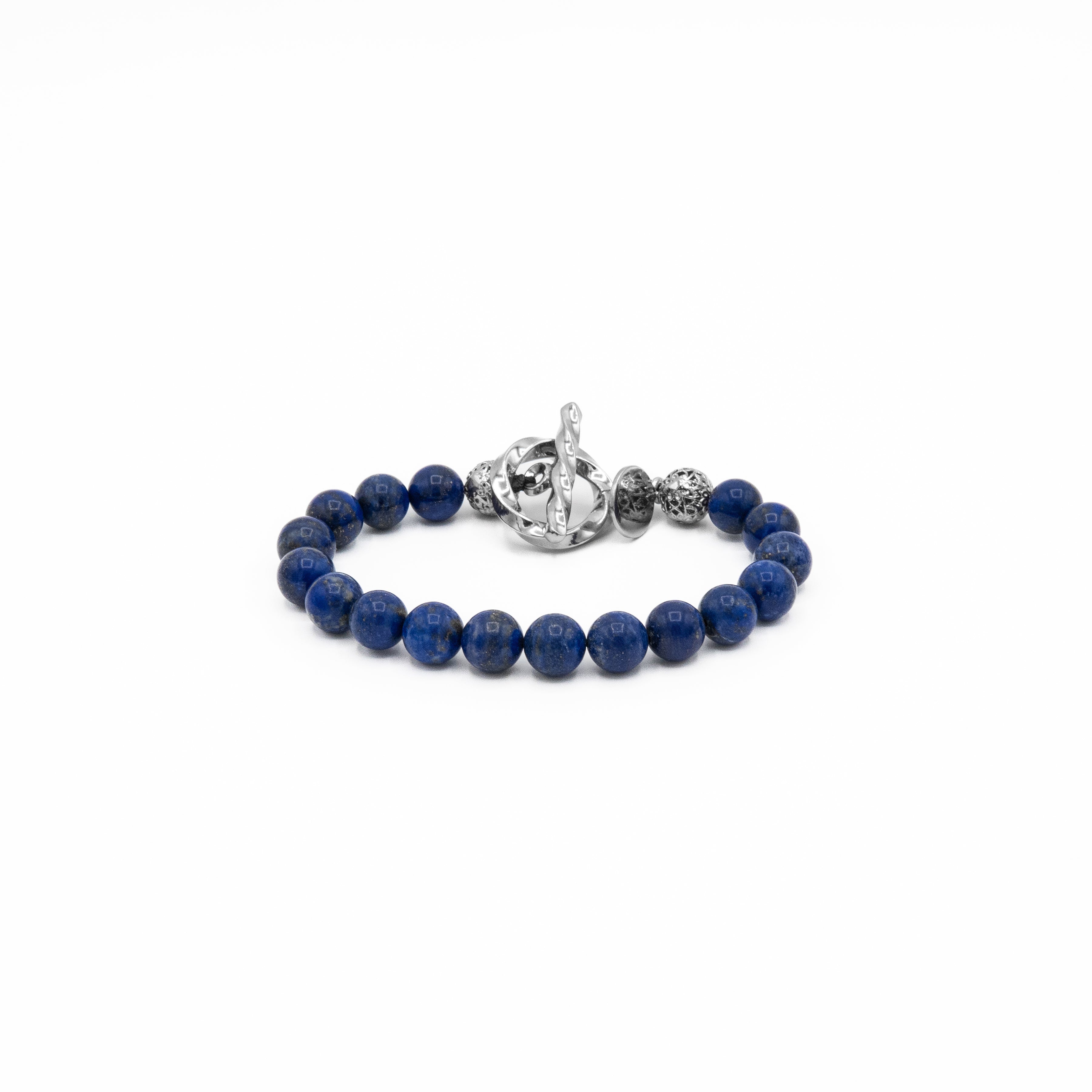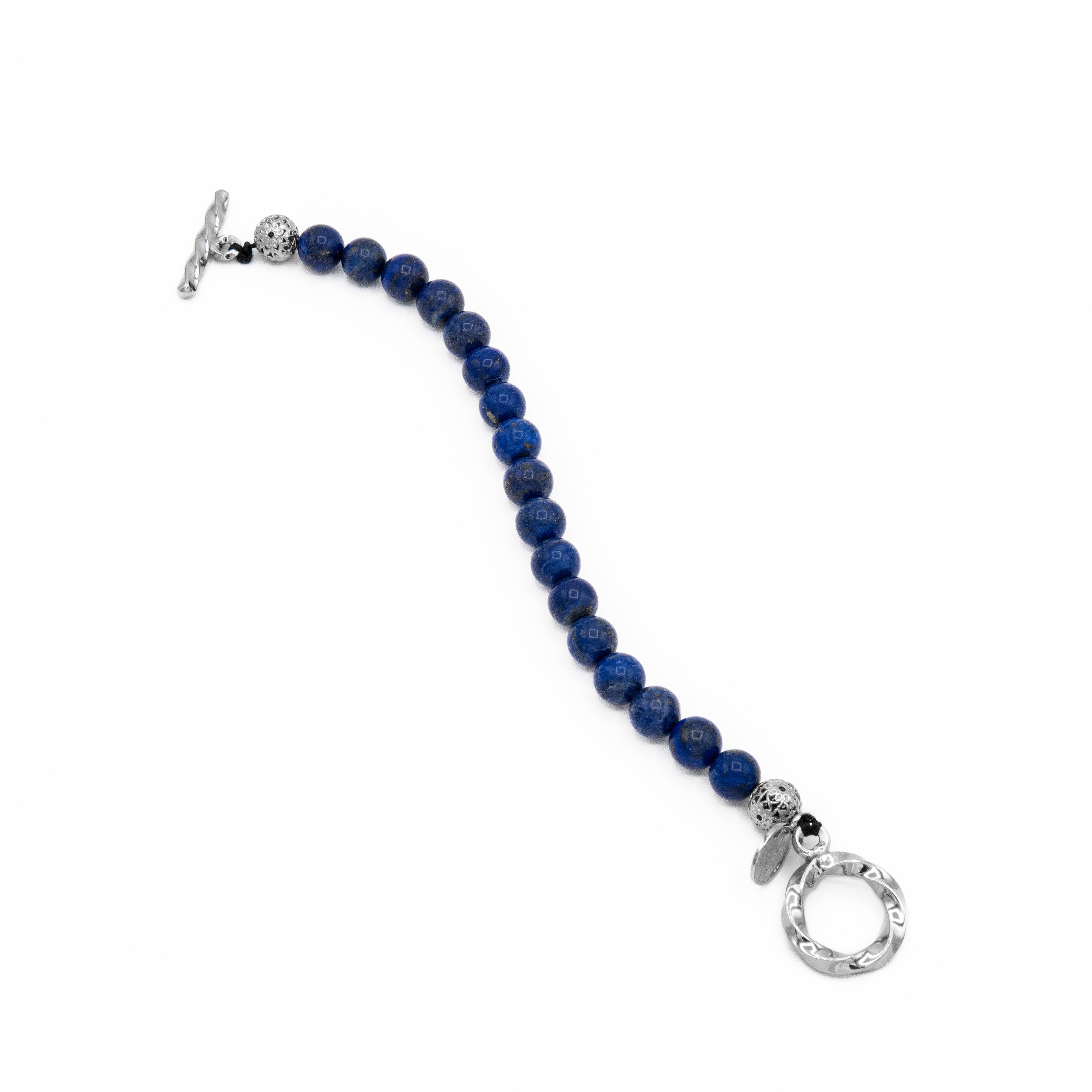 This bracelet is a harmonious blend of deep-sea mystery and artisanal elegance, crafted for those who value both understated beauty and impactful design. Expertly handcrafted, it showcases two ornate sterling silver beads that beautifully bookend a series of genuine Lapis Lazuli stones. The bracelet is secured with a toggle lock, making it both practical and visually appealing.