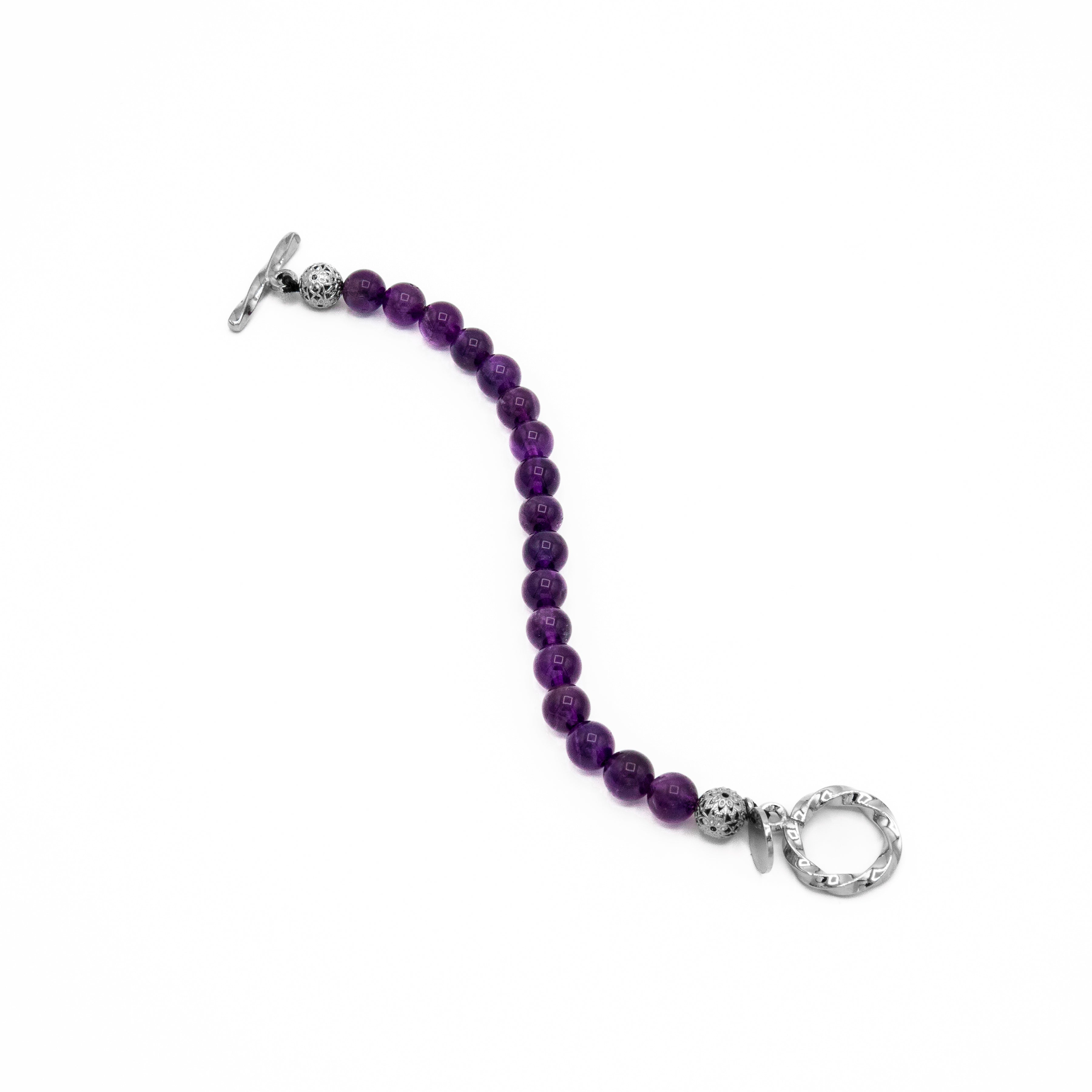 This bracelet is a captivating blend of spiritual elegance and timeless design! Meticulously handcrafted, it features two intricately detailed sterling silver beads that frame a series of Amethyst stones. The design is secured with a classic toggle lock, adding both a touch of security and a sophisticated flourish.