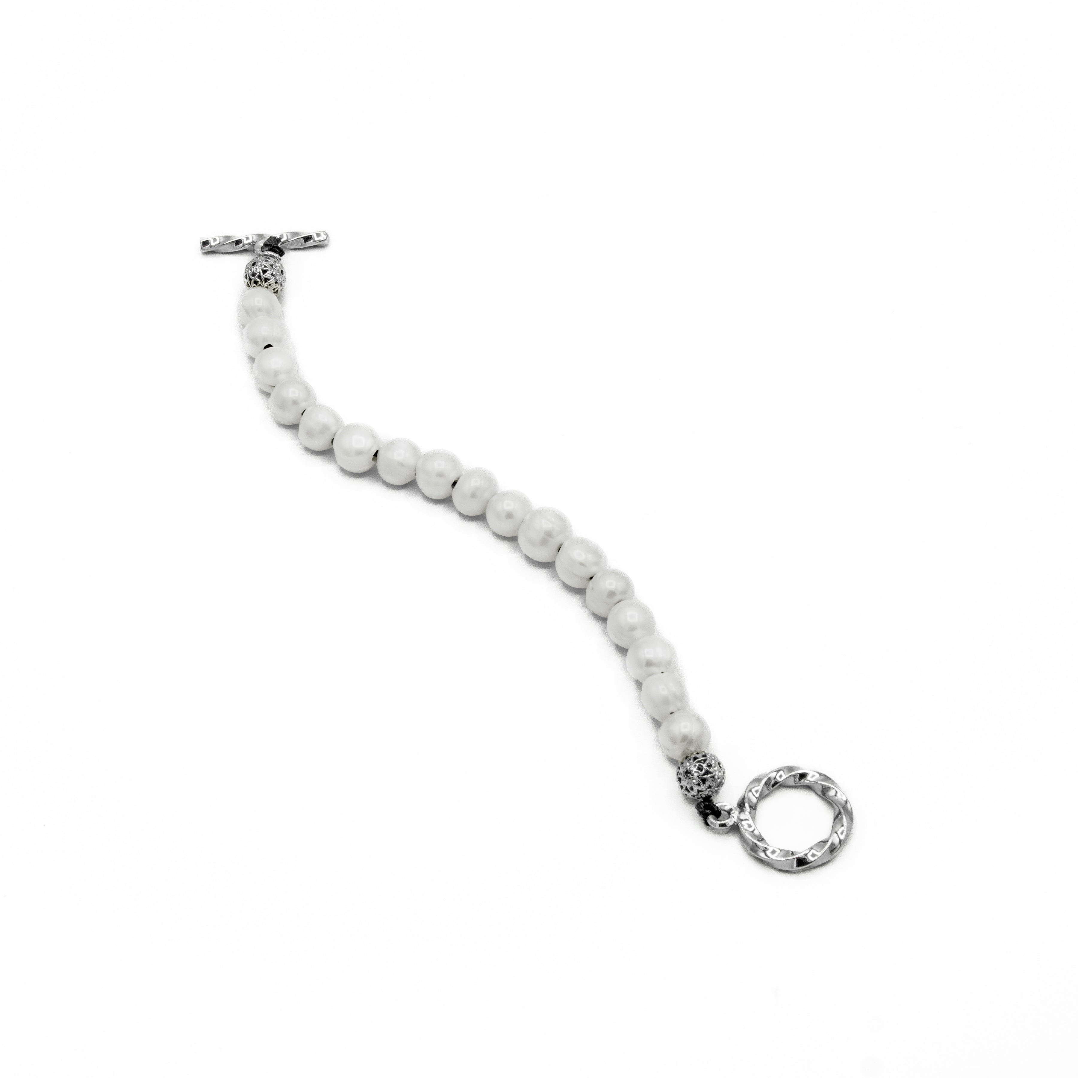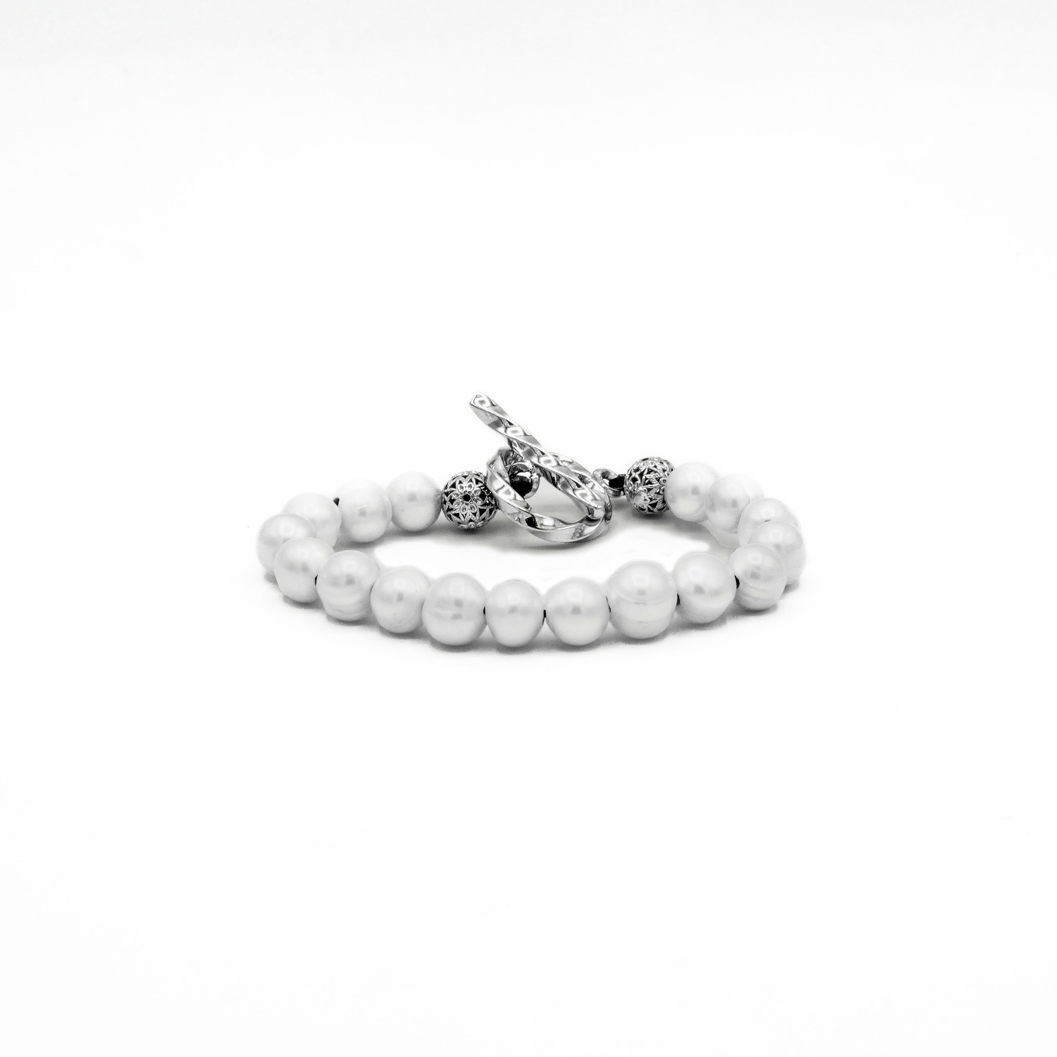 This bracelet is a graceful and timeless piece, designed for those who appreciate classic beauty with a modern touch. Meticulously handcrafted, it features two intricately detailed sterling silver beads that frame a series of genuine white pearls. The design is secured with a classic toggle lock, adding both a touch of security and a sophisticated flourish.