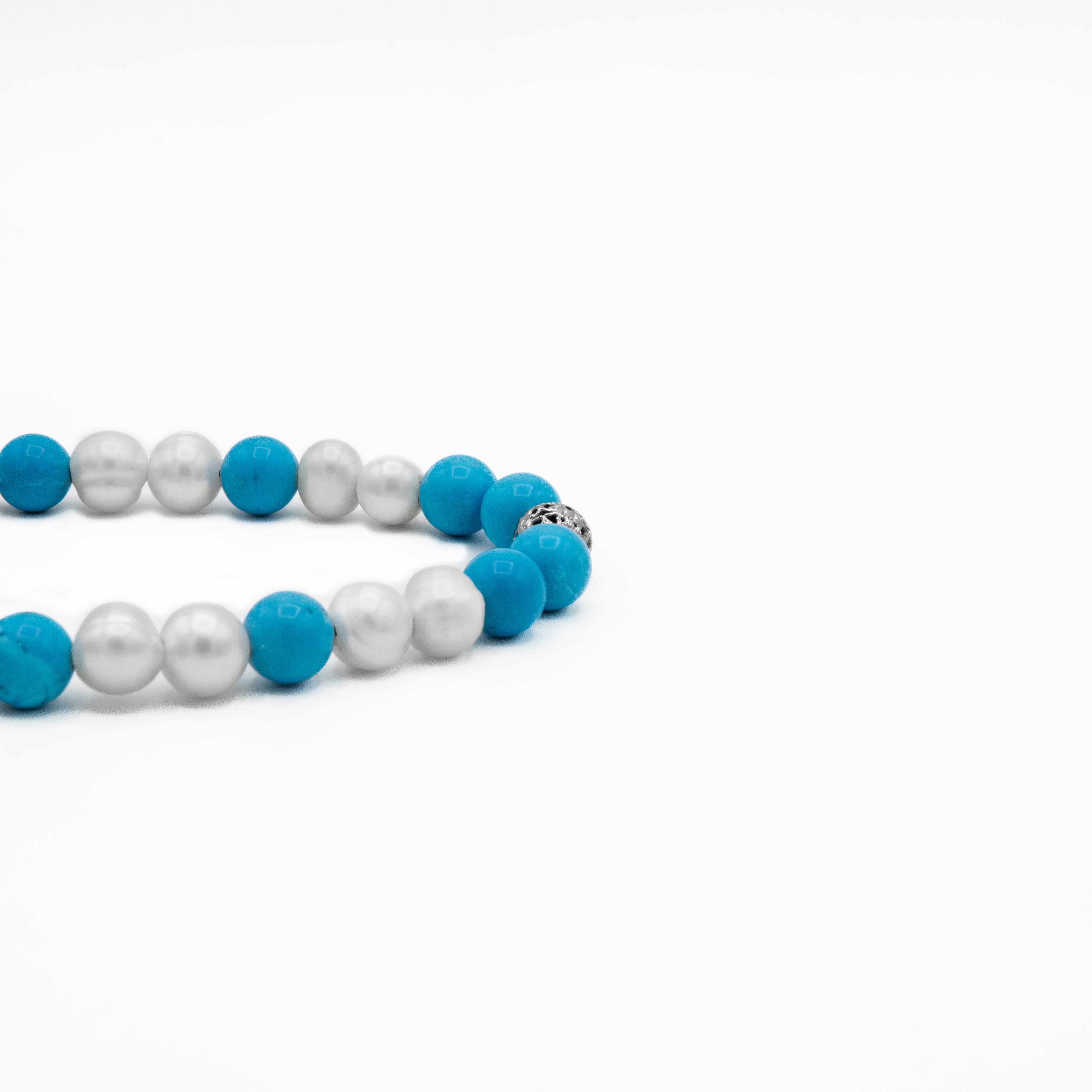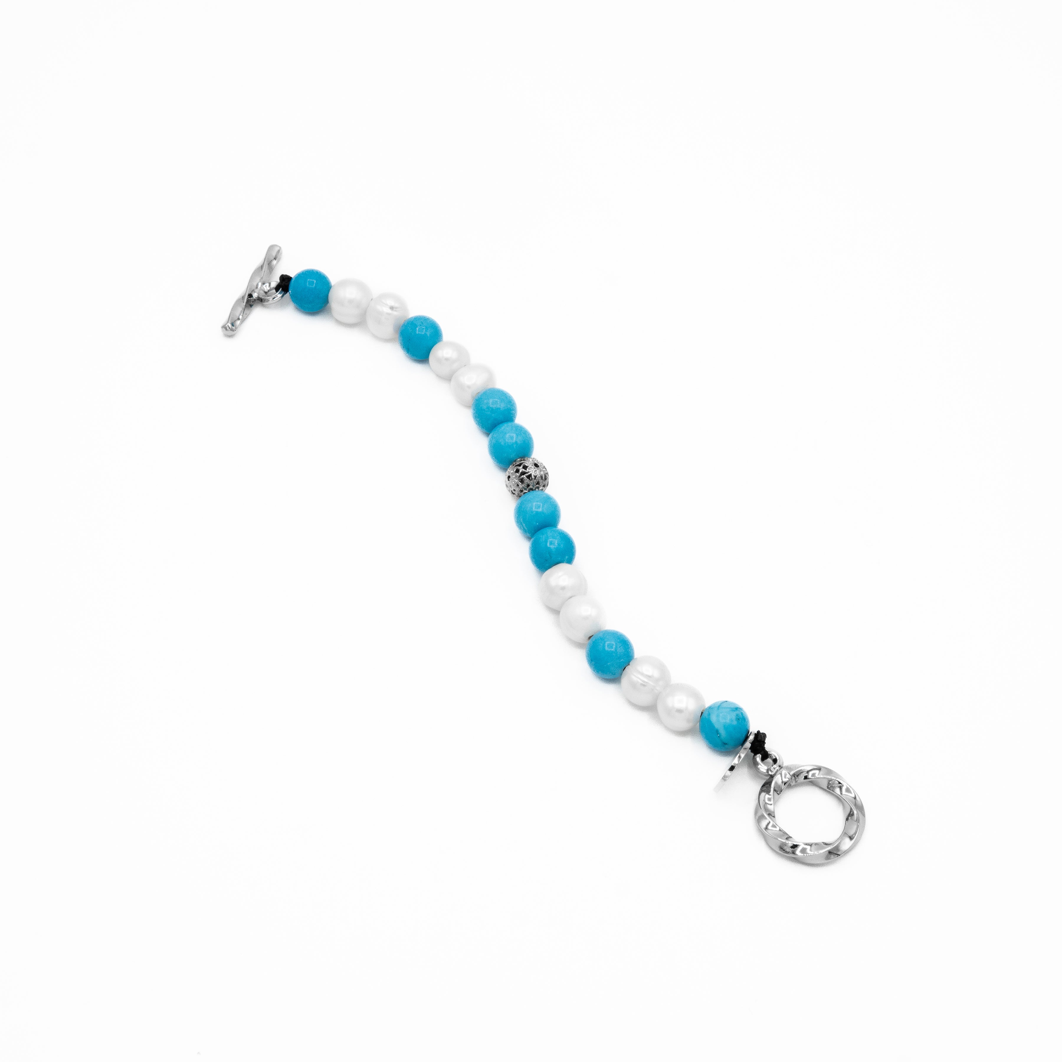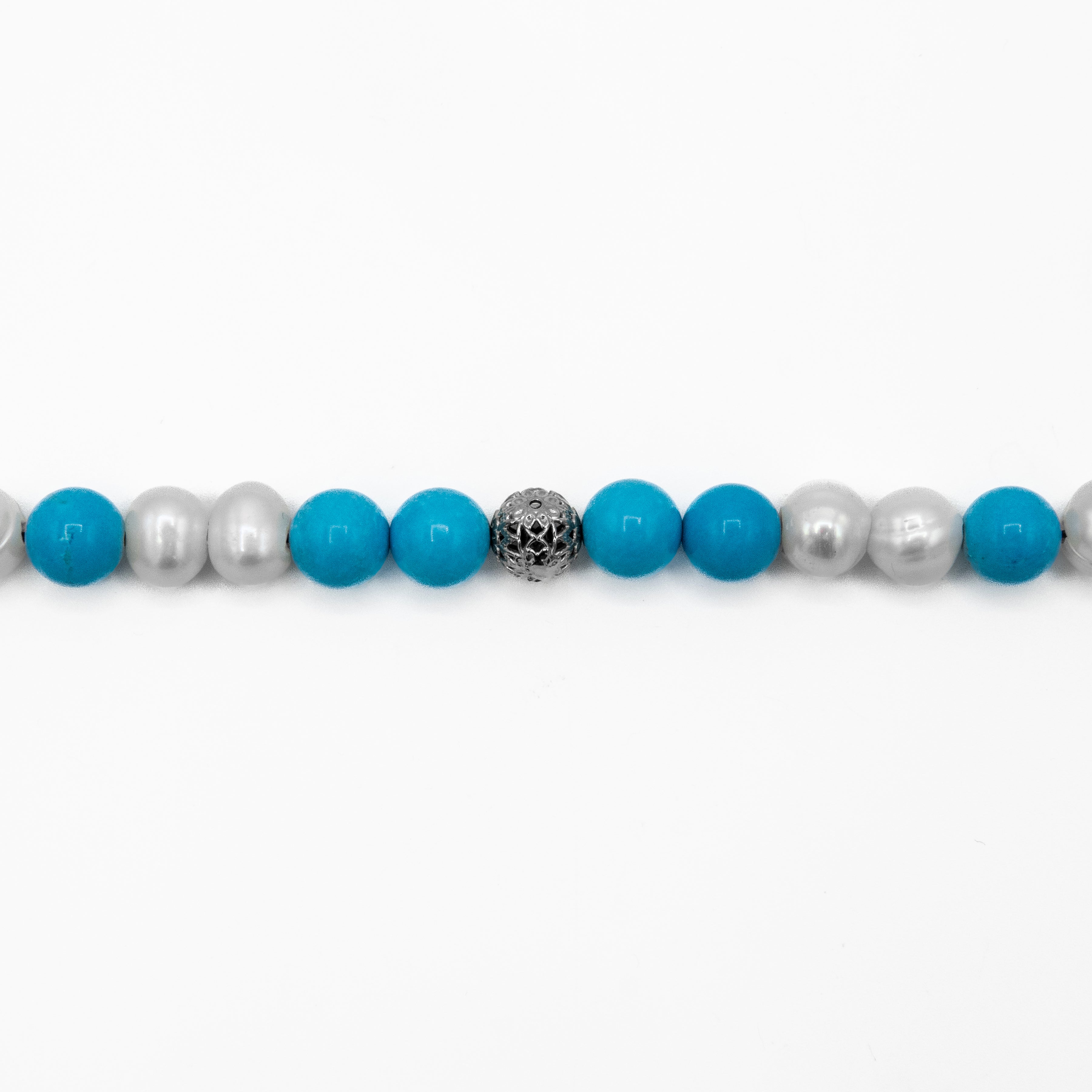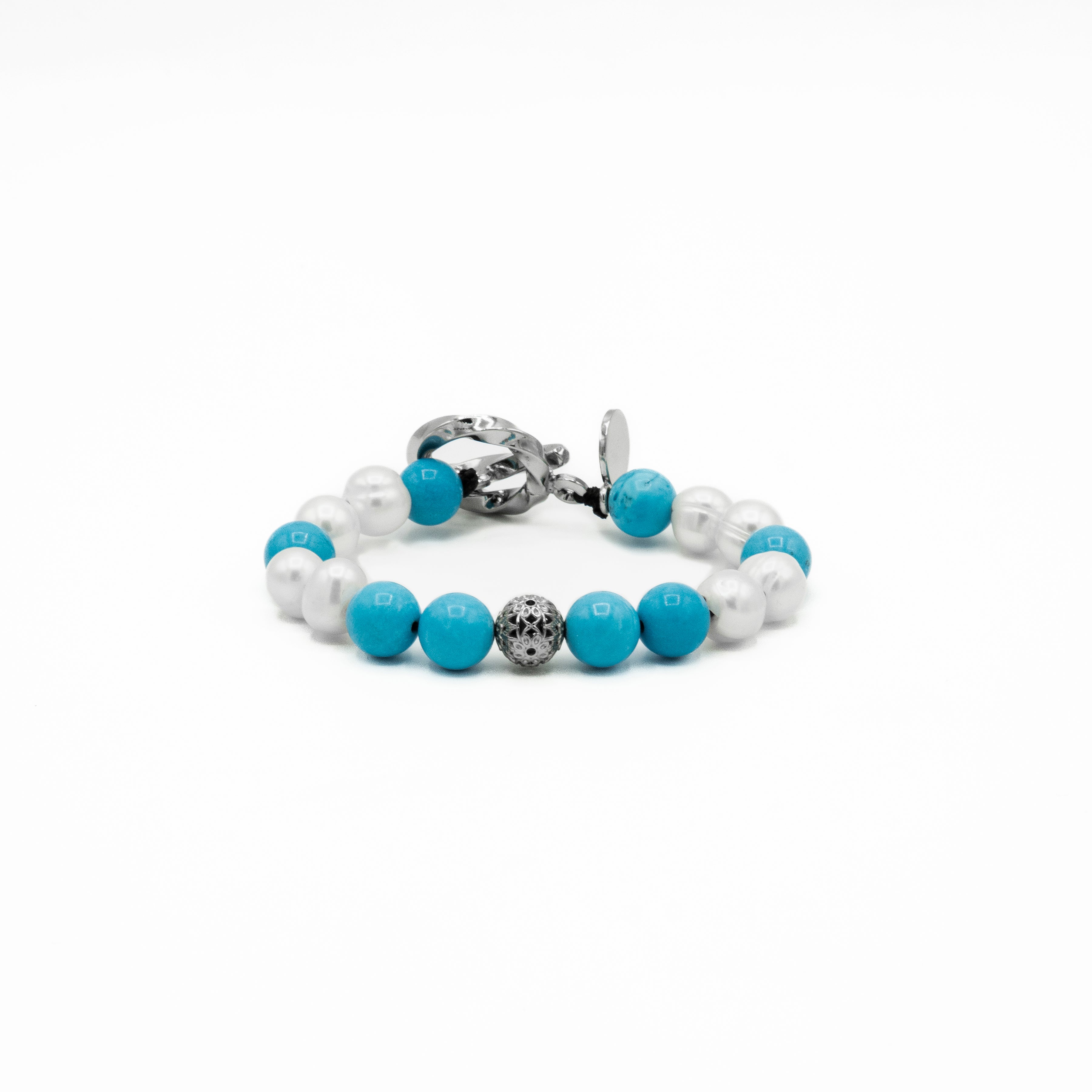 This bracelet is a vibrant and serene celebration of contrasting hues, designed to evoke the tranquility of a tropical oasis. Meticulously handcrafted, it features an elegant alternating pattern of luminous white pearls and striking blue-green Turquoise stones. A single, intricately detailed sterling silver bead is placed prominently at the center, and the piece is secured with a distinguished toggle lock.